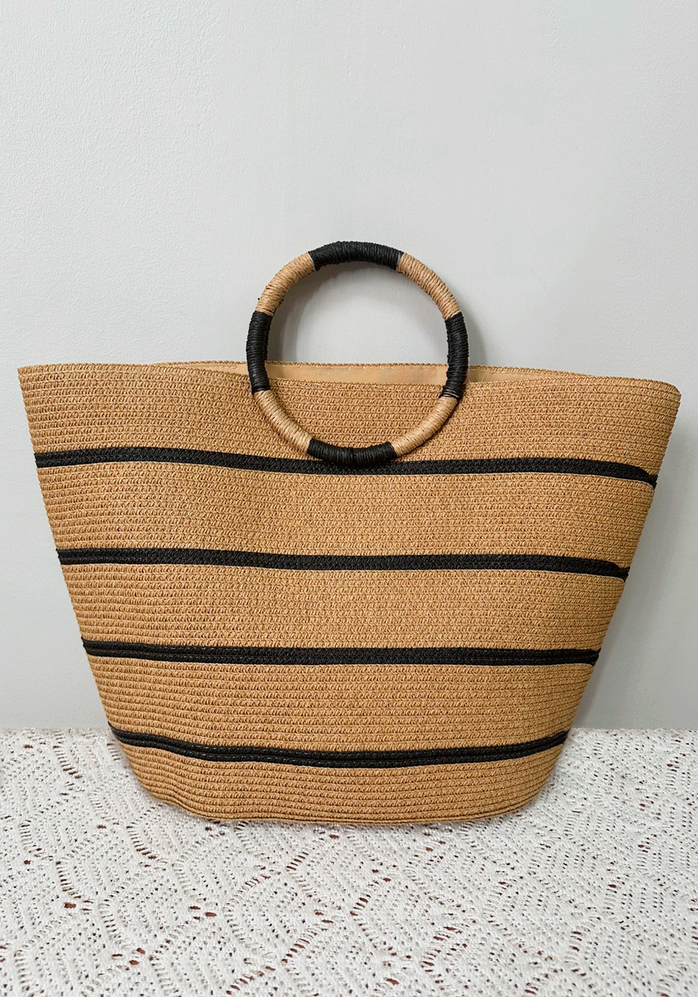 La cartera Black Camel Bag está confeccionada en fibra natural tejida en tono camel, con un diseño estructurado que destaca por sus líneas horizontales en color negro, aportando contraste y elegancia. Cuenta con asas circulares forradas en fibra natural y detalles negros, que le dan un toque sofisticado y moderno.